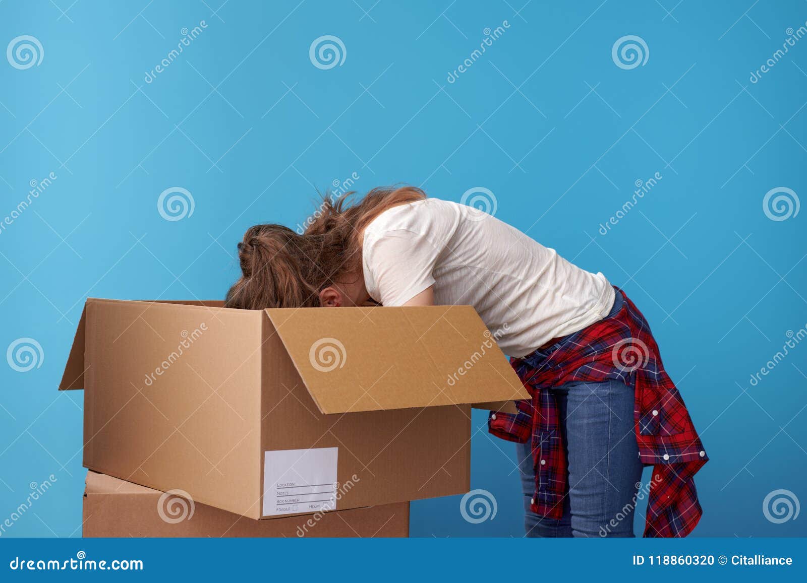 Modern Hipster Looking For Something In Cardboard Box On Blue Stock Photo Image Of House Caucasian 118860320