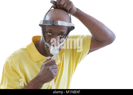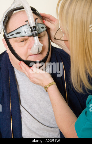 Uomo Con Un Disturbo Del Sonno Cerca Su Una Cpap Per La Prima Volta L Uomo Impara A Regolare La Sua Apparecchiatura Cpap Su Sfondo Bianco Foto Stock Alamy