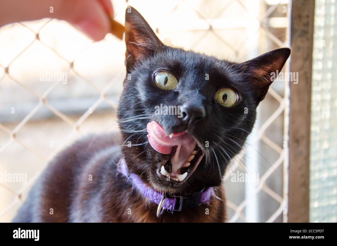 Close Up On Black Cat With Tongue Out Stock Photo Alamy
