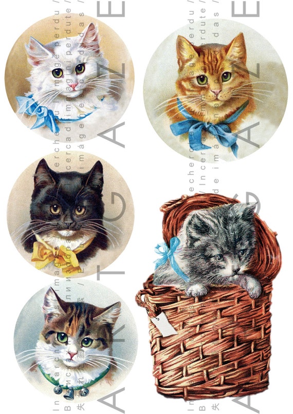 5 Cats Adorable Antique Images Kittens Vintage Illustration Etsy