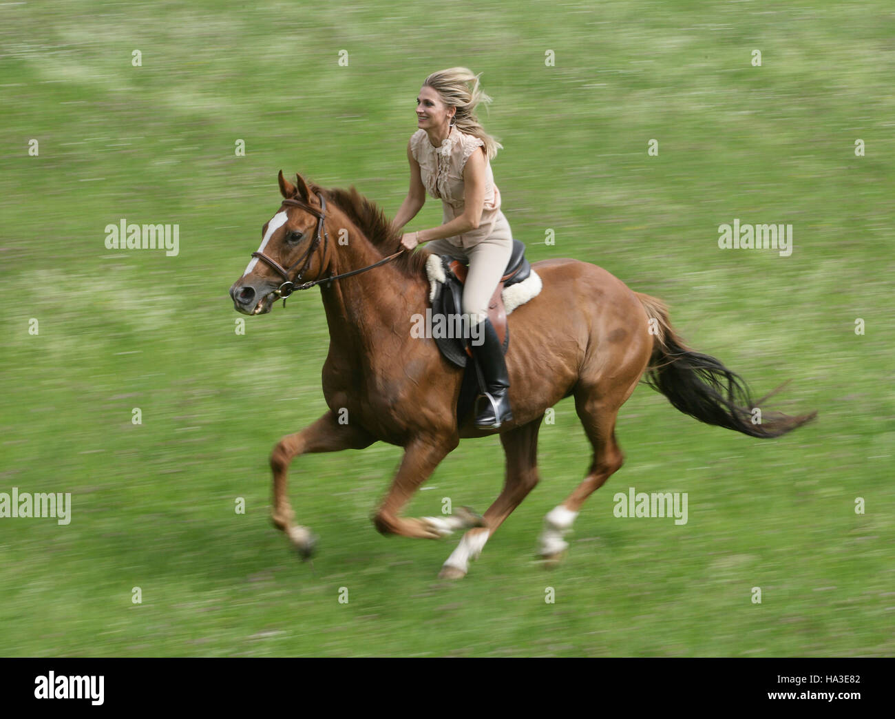 Cavallerizza Su Cavallo Al Galoppo Attraverso Un Verde Prato Foto Stock Alamy