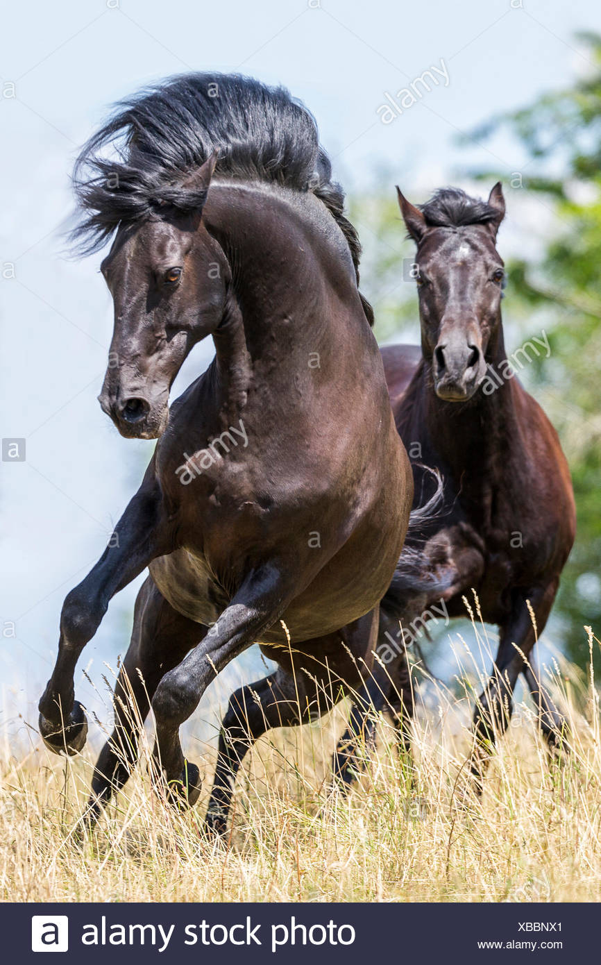 Barb Cavallo E American Quarter Horse Due Cavalli Al Galoppo Su Un Pascolo Germania Foto Stock Alamy