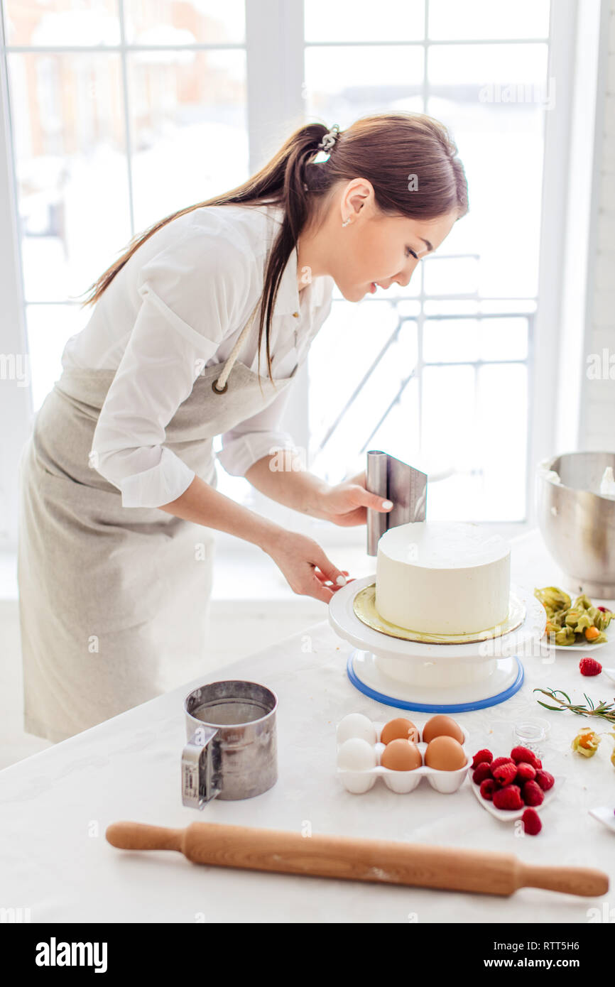 Hardworking Girl Giving Smooth Edges To Cake Close Up Side View Photo Stock Photo Alamy