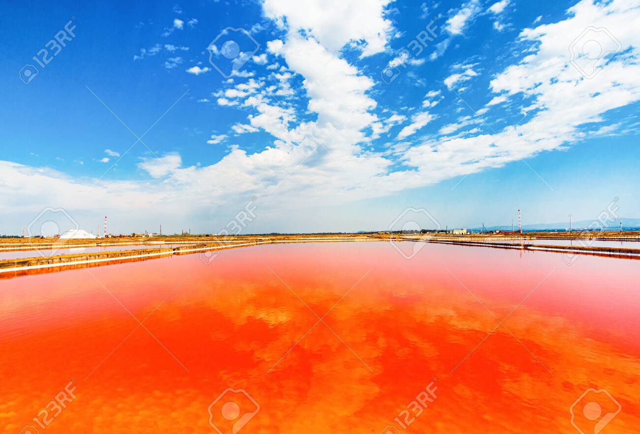 Lago Di Sale Rosso Con Riflesso Cielo Nuvoloso Presso Le Saline Stock Photo Picture And Royalty Free Image Image 149896746