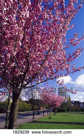 Vista Dal Basso Di Un Albero Di Ciliegio Giapponese In Fiore In Un Prato Erboso Da Una Soleggiata Primavera Pomeriggio Con Rami Carichi Di Grappoli Di Fiori Rosa Foto Stock Alamy