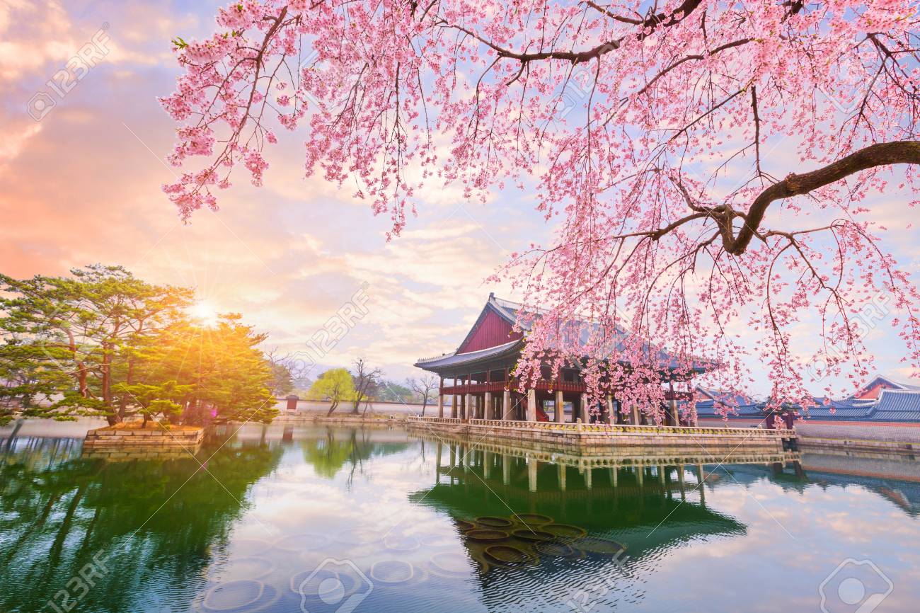 Immagini Stock Palazzo Di Gyeongbokgung Con Albero Di Ciliegio In Primavera In Citta Di Seoul Di Corea Corea Del Sud Image 77284026