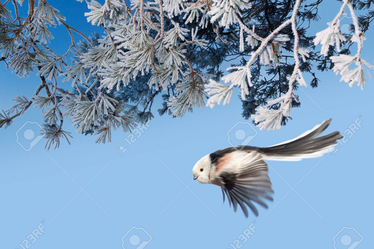 Immagini Stock Codibugnolo Aegithalos Caudatus Volando Giu Da Rami Di Pino Coperti Di Brina Nella Foresta Di Inverno Nord Bielorussia Image 67793862