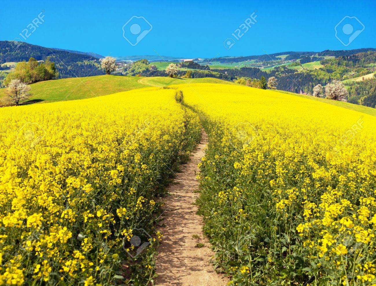 Immagini Stock Campo Di Colza Colza O Colza Con Parhway E Vicolo Di Ciliegi In Fiore Brassica Napus Semi Di Colza E La Pianta Per L Energia Verde E L Industria