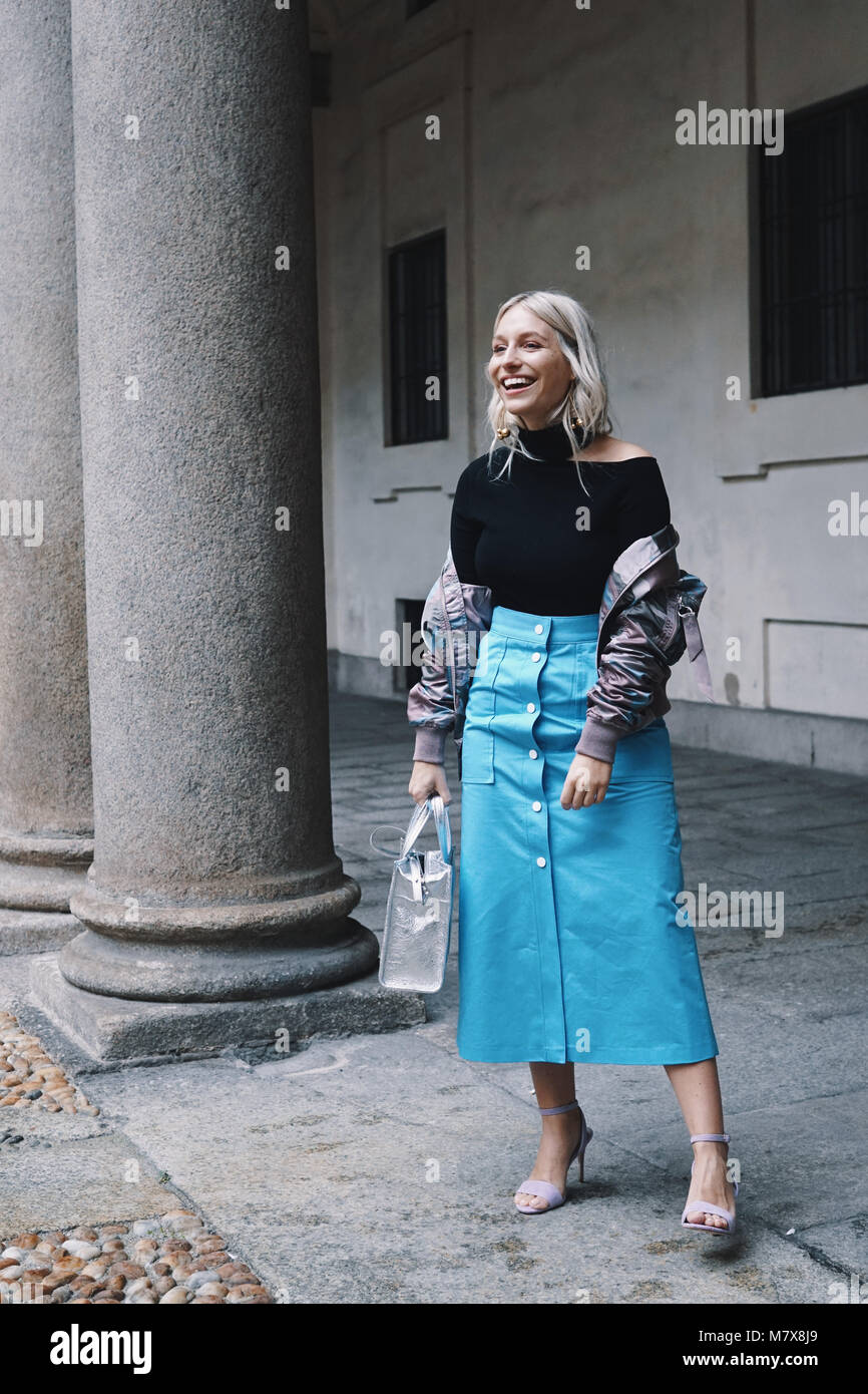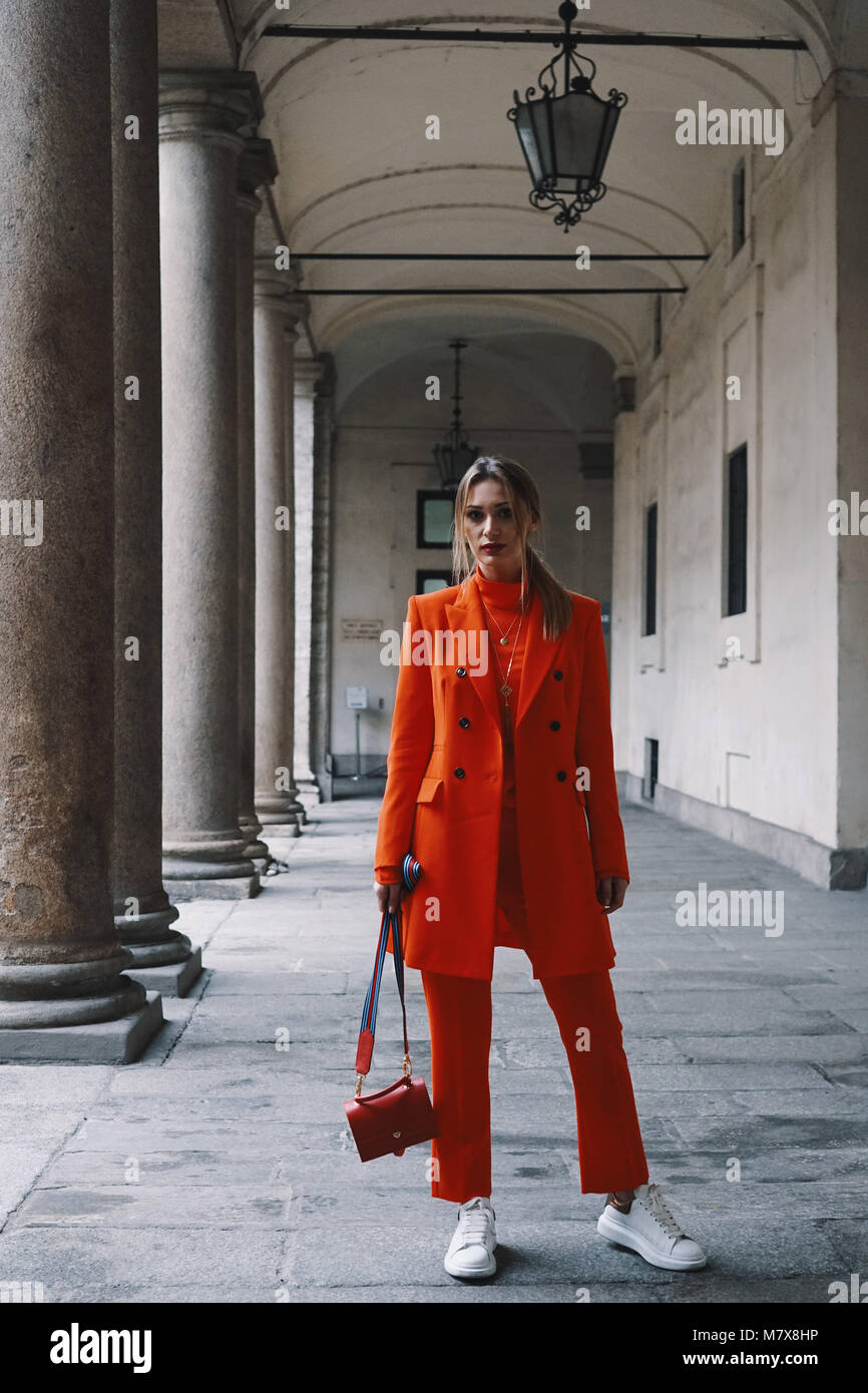 Milano Italia 22 Febbraio 2018 Consulente Di Moda In Posa Dopo Una Mostra Durante La Settimana Della Moda Milanese Foto Stock Alamy