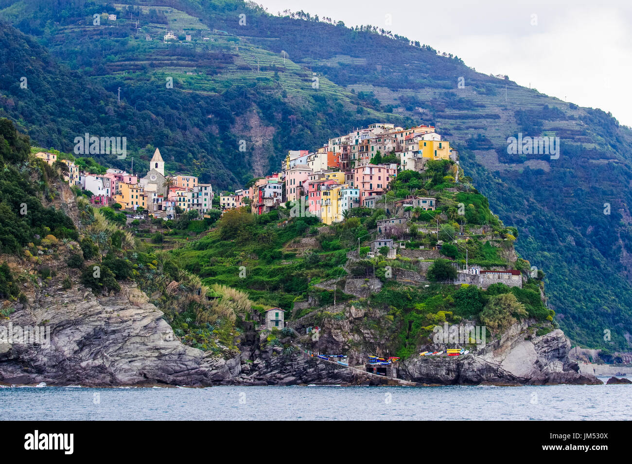 Panorama View From The Sea To Corniglia Cinque Terre Italy Stock Photo Alamy