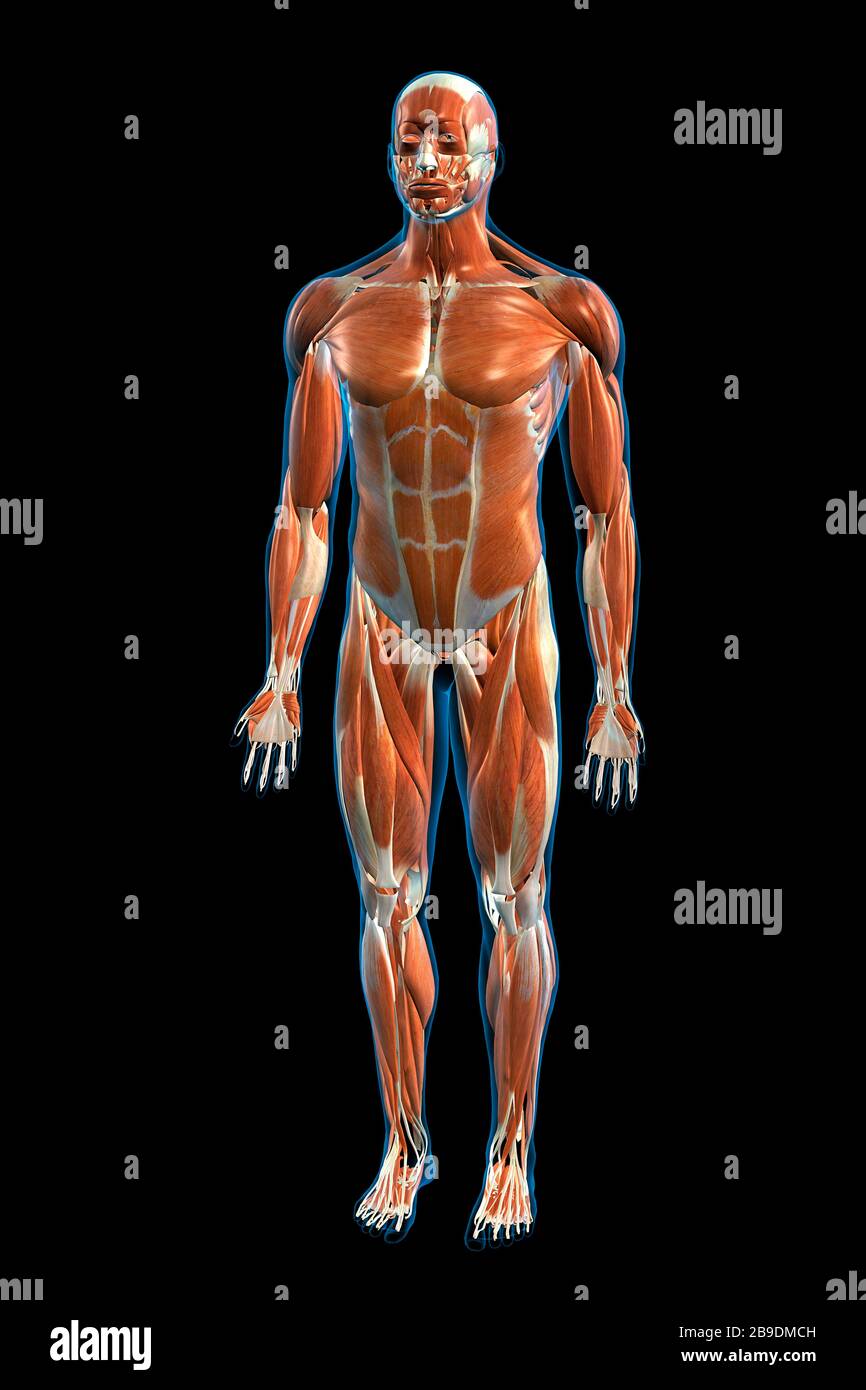 Vista Frontale Del Sistema Muscolare Del Corpo Umano Maschile Su Sfondo Nero Foto Stock Alamy