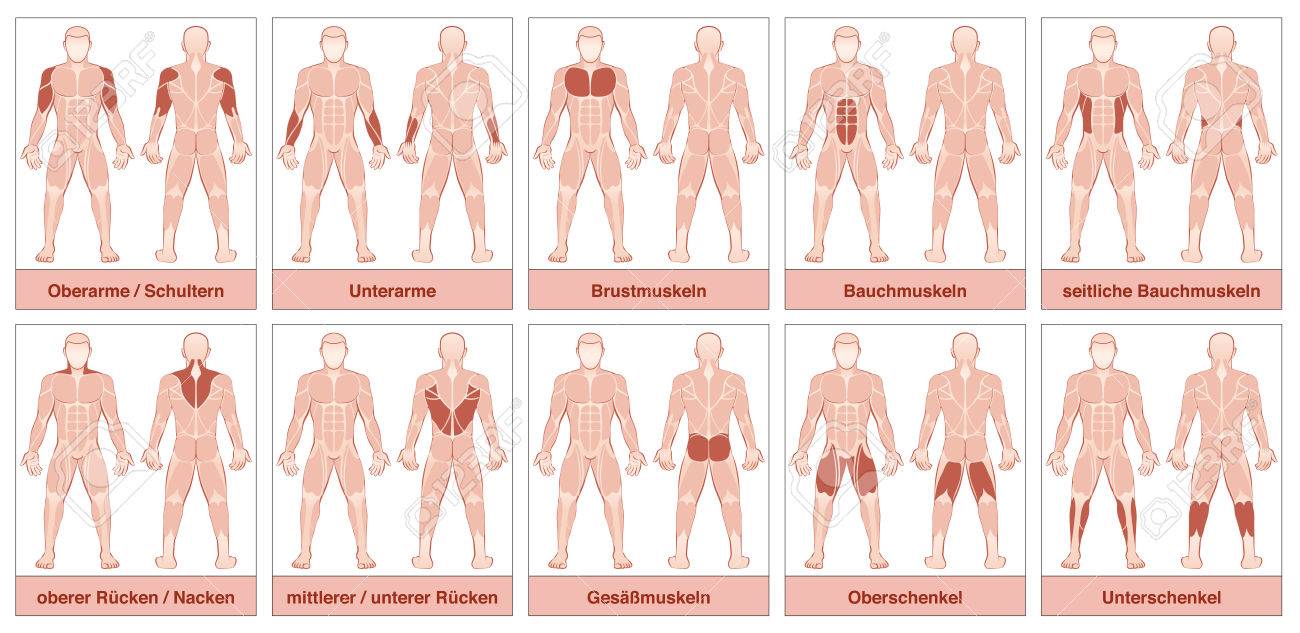 Vettoriale Grafico Muscolare Con Nomi Tedeschi Corpo Maschile Con I Piu Grandi Muscoli Umani Suddiviso In Dieci Carte Etichettate Con Nomi E Opportuni Gruppi Muscolari Evidenziati Image 83775701