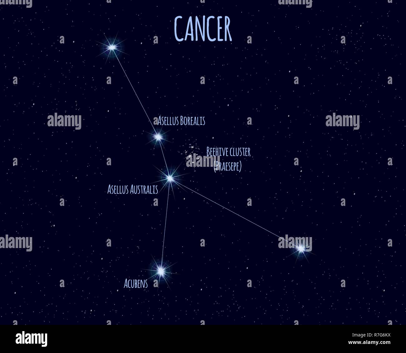 Costellazione Del Cancro Illustrazione Vettoriale Con I Nomi Delle Stelle Di Base Contro Il Cielo Stellato Immagine E Vettoriale Alamy