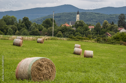 Croazia 26 06 2018 Covoni Di Fieno Su Prati Verdi In Campagna E La Chiesa Parrocchiale Del Piccolo Villaggio Di Dreznik Grad Nella Zona Dei Laghi Di Plitvice Buy This Stock Photo And