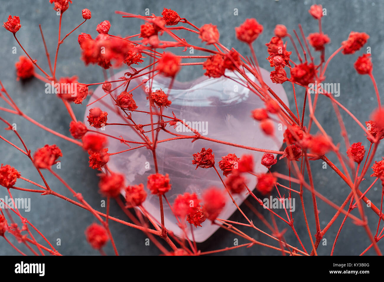 Mazzetto Di Piccolo Rosso Fiori Delicati Forma Di Cuore Rosa Cristallo Di Quarzo Zucchero Candito Spruzza Su Sfondo Grigio San Valentino Romantico Giornata Della Madre Della Carita Foto Stock Alamy