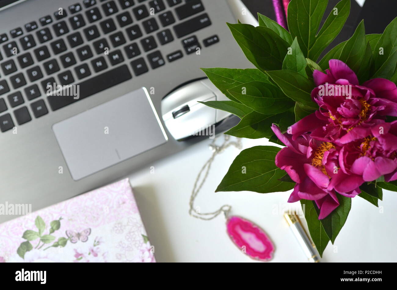 Bold Pink Peonies On White And Black Theme Creative Workspace With Stationery Closeup Freelancing And Working From Home Feminine Creative Work Desk Stock Photo Alamy
