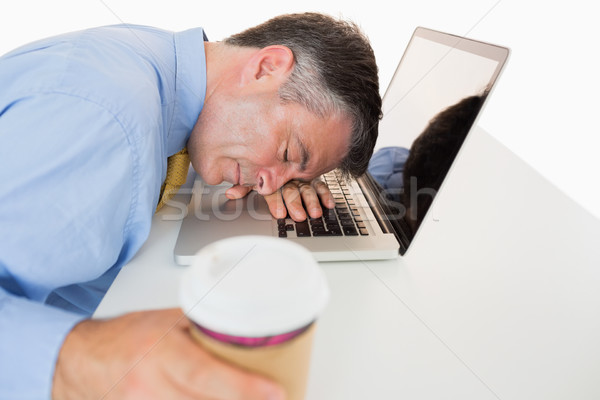 Exhausted Man Holding Coffee And Sleeping On His Laptop On His Desk In A White Background Stock Photo C Wavebreak Media 2740781 Stockfresh