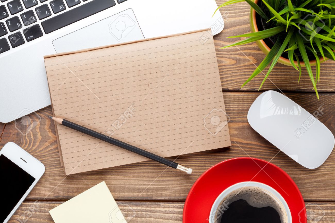 Top View Of Woman At Wooden Desk With Notebook Cell Phone And Laptop Office Workplace Stock Photo 265360030