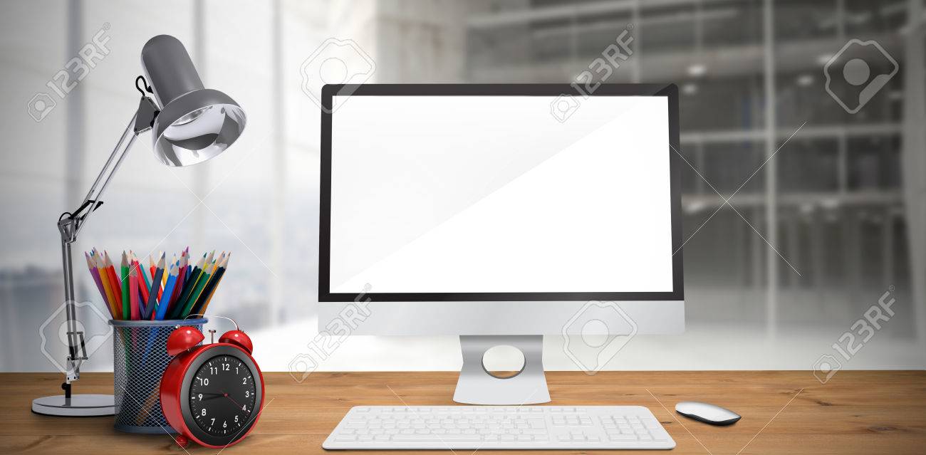Image Of A Desk With Computer Against Modern Room Overlooking Stock Photo Picture And Royalty Free Image Image 55281886