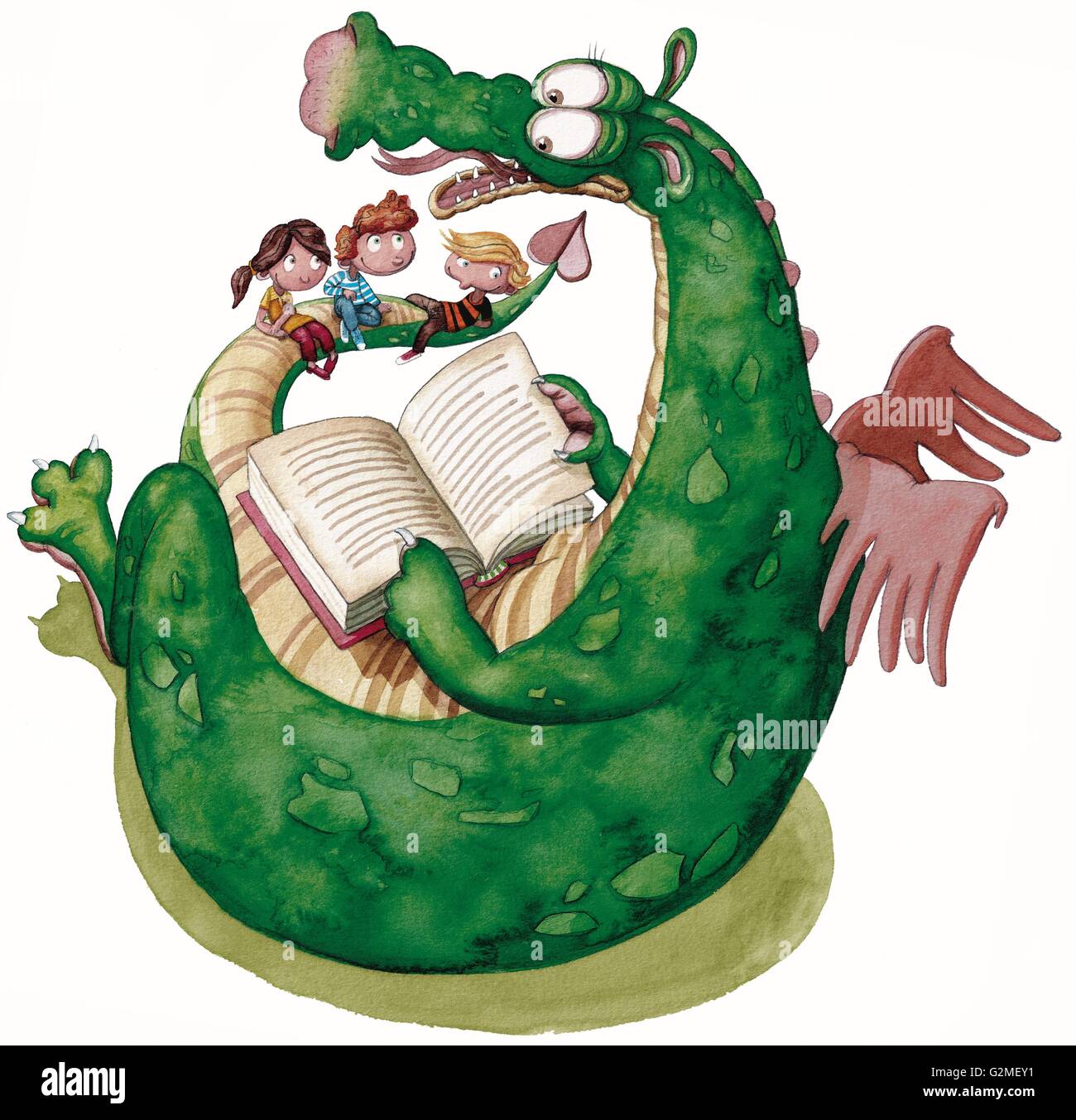 Bambini Seduti Con Il Drago E Il Libro Di Lettura Foto Stock Alamy