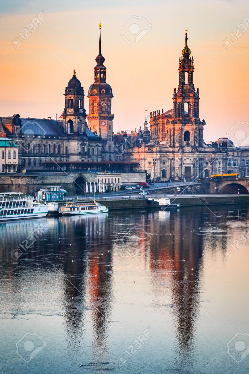 Immagini Stock Dresda Germania Cattedrale Della Santissima Trinita O Hofkirche Terrazza Di Bruehl Tramonto Tramonto Sul Fiume Elba In Sassonia Image 75479939
