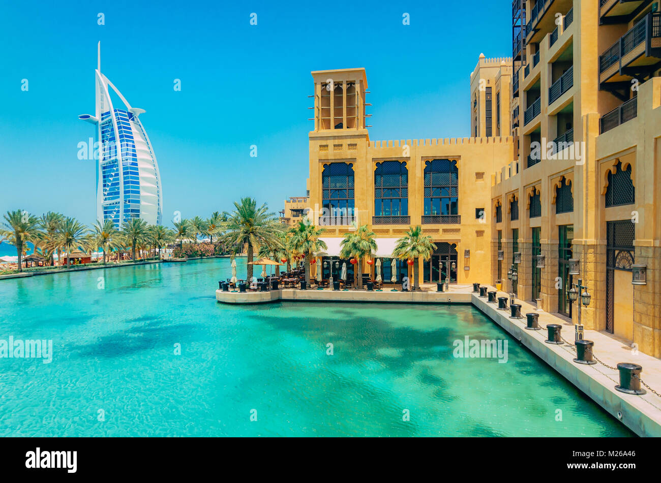 Burj Al Arab Vista Dal Madinat Jumeirah Dubai Splendida Vista Su Hotel La Vela Mercato E Area Di Passeggio Con Una Bella Vista Dei Canali Con Acqua Di Mare Foto Stock