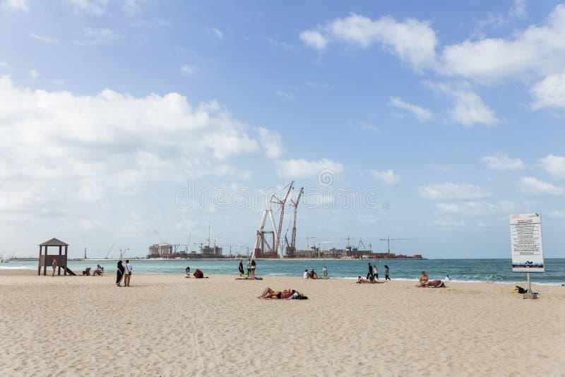 Spiaggia Pubblica E Mare Blu Con La Gente E Cantiere Nei Precedenti Al Dubai Immagine Stock Editoriale Immagine Di Centrale Mare 99987679