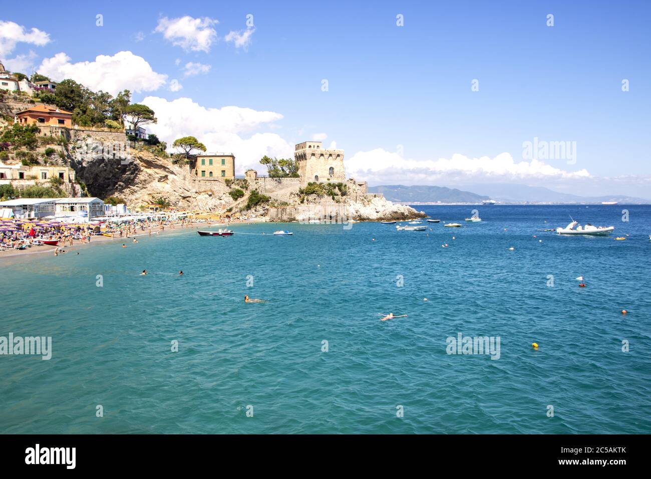 Beautiful View Of Moored Fishing Boats At Erchie Beach With Old Castle In Background On Sunny Summer Day Amalfi Coast Salerno Campania Italy Stock Photo Alamy