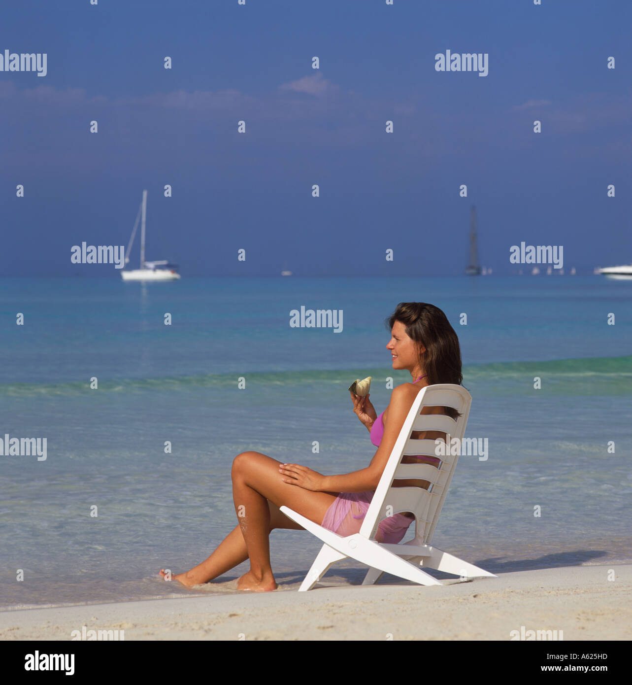 Scena Sulla Spiaggia Es Trenc Platja De Trenc In Se Mallorca Ragazza In Bikini Mangiare Melone Sulla Sedia Spiaggia Da Waters Edge Baleares Spagna Foto Stock Alamy