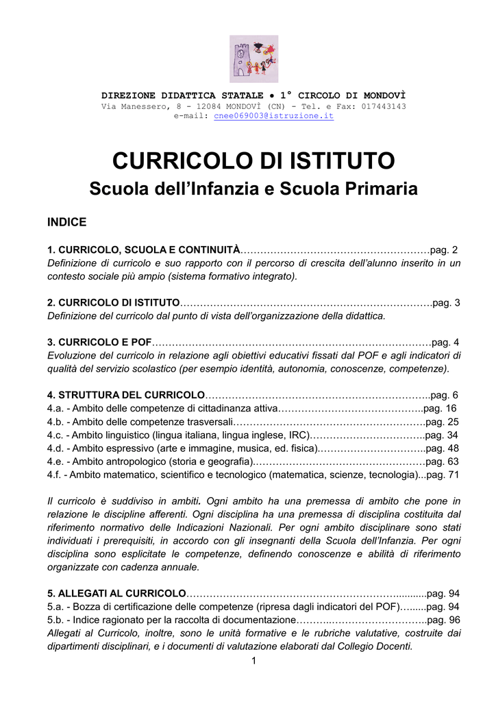 Curricolo Di Istituto Direzione Didattica 1 Circolo Mondovi