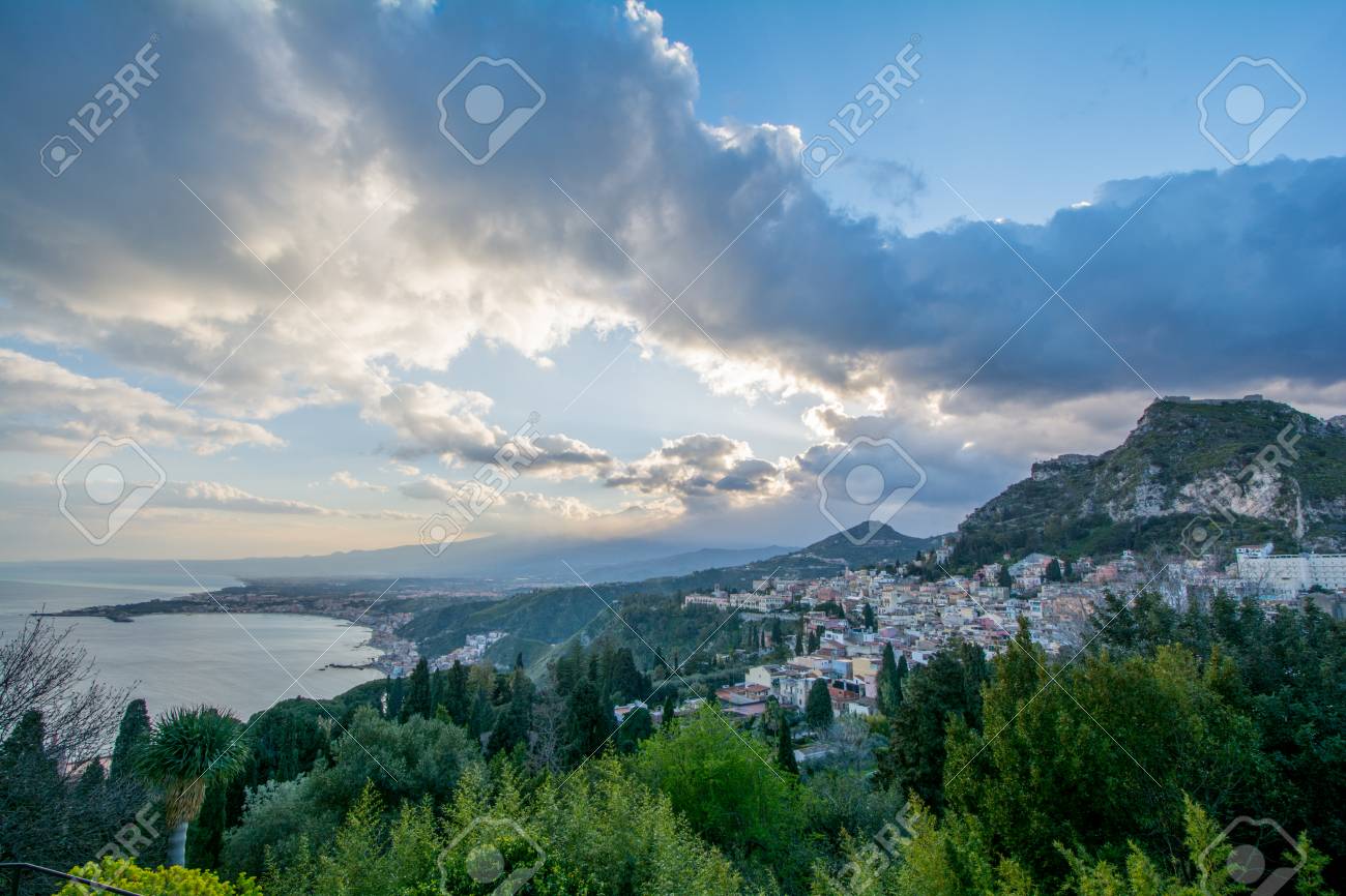 City Of Taormina In Sicily With Vulcano Etna In Background Stock Photo Picture And Royalty Free Image Image 39263190