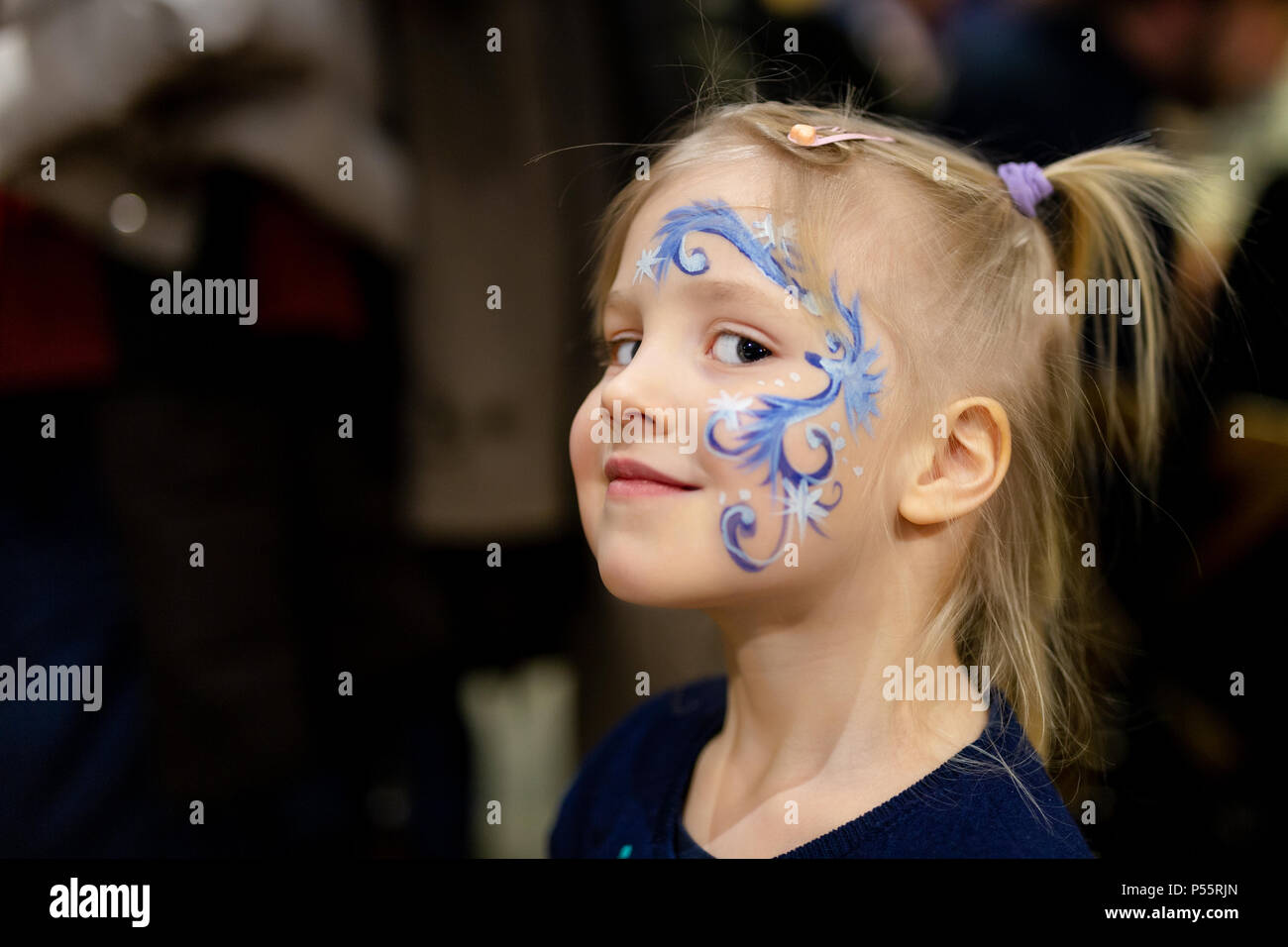 Carino Bimba Bionda Con Face Painting Blue Astratto Schema A Fiocco Di Neve Da Acquerello Su Bambini Faccia Adorabile Bambino Con Disegni Colorati Bambini Foto Stock Alamy