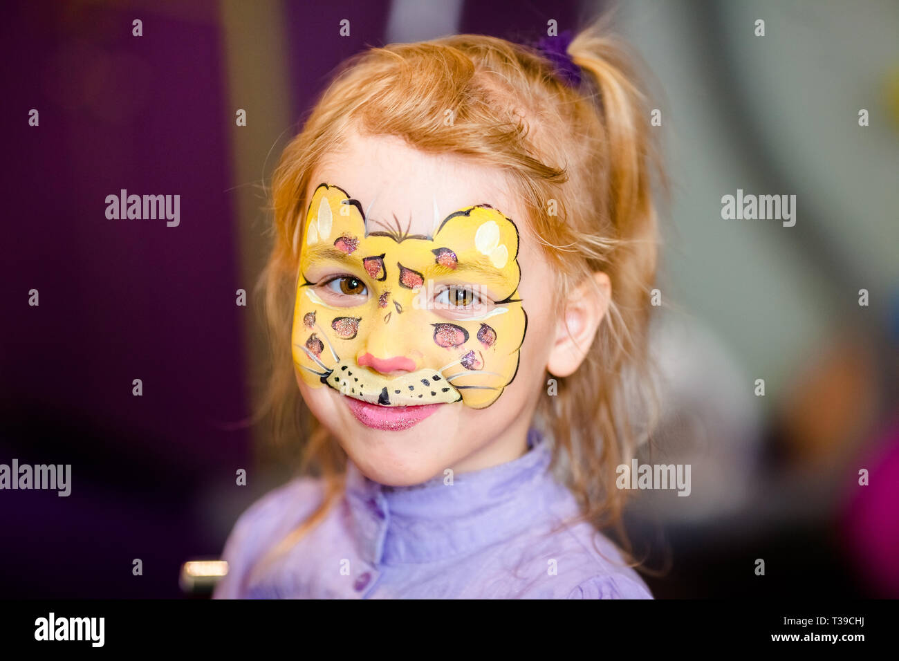 Bambino Animatore Artista Disegna A Mano Face Painting Per La Bambina Un Bambino Con Un Divertente Volto Dipinto Un Pittore Rende Giallo Leopard Al Viso Della Bambina Bambini Foto Stock Alamy
