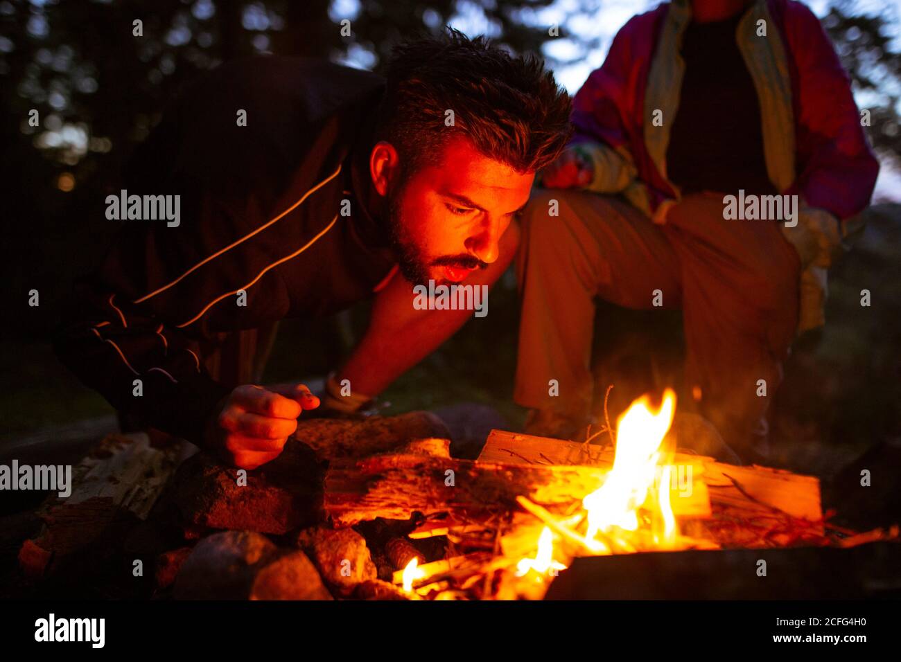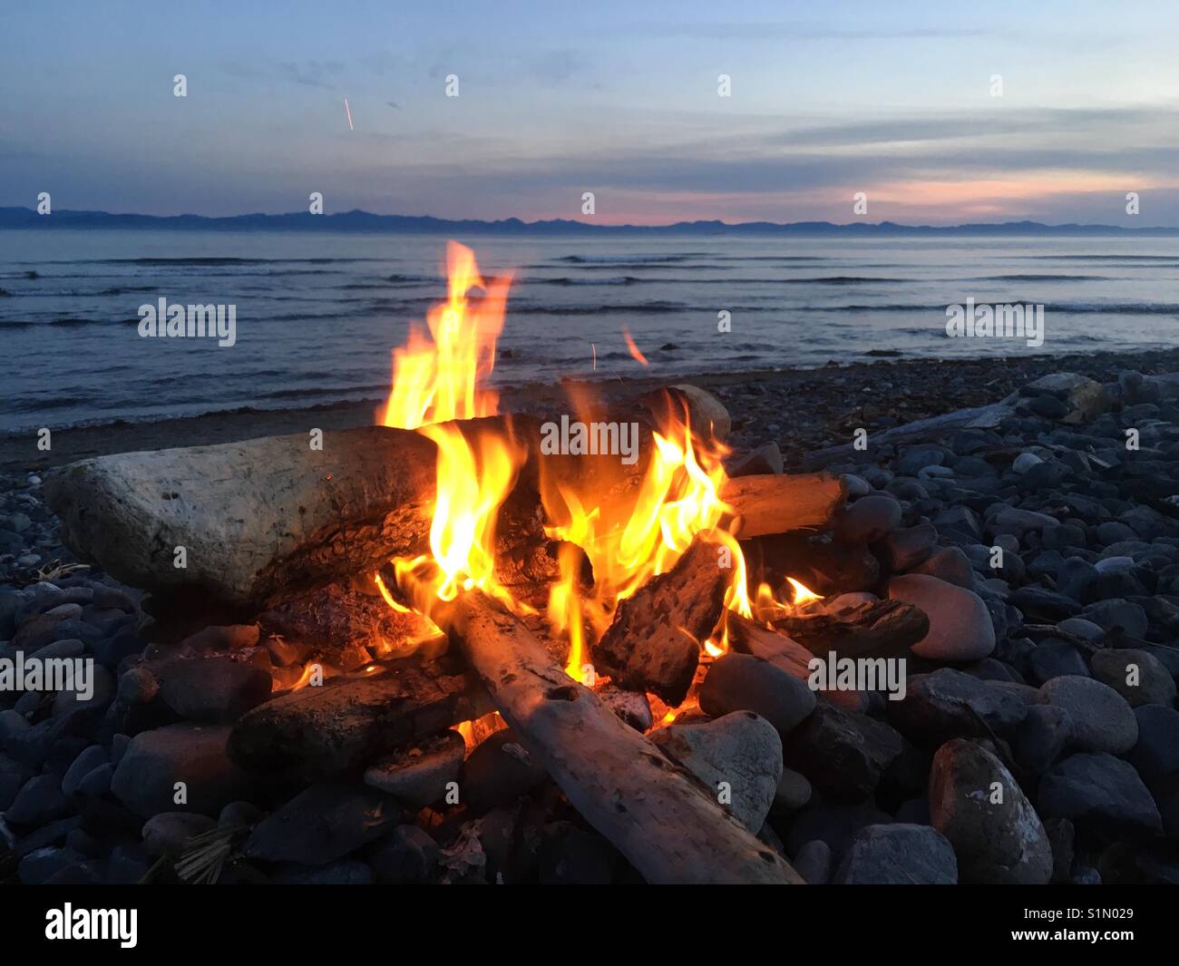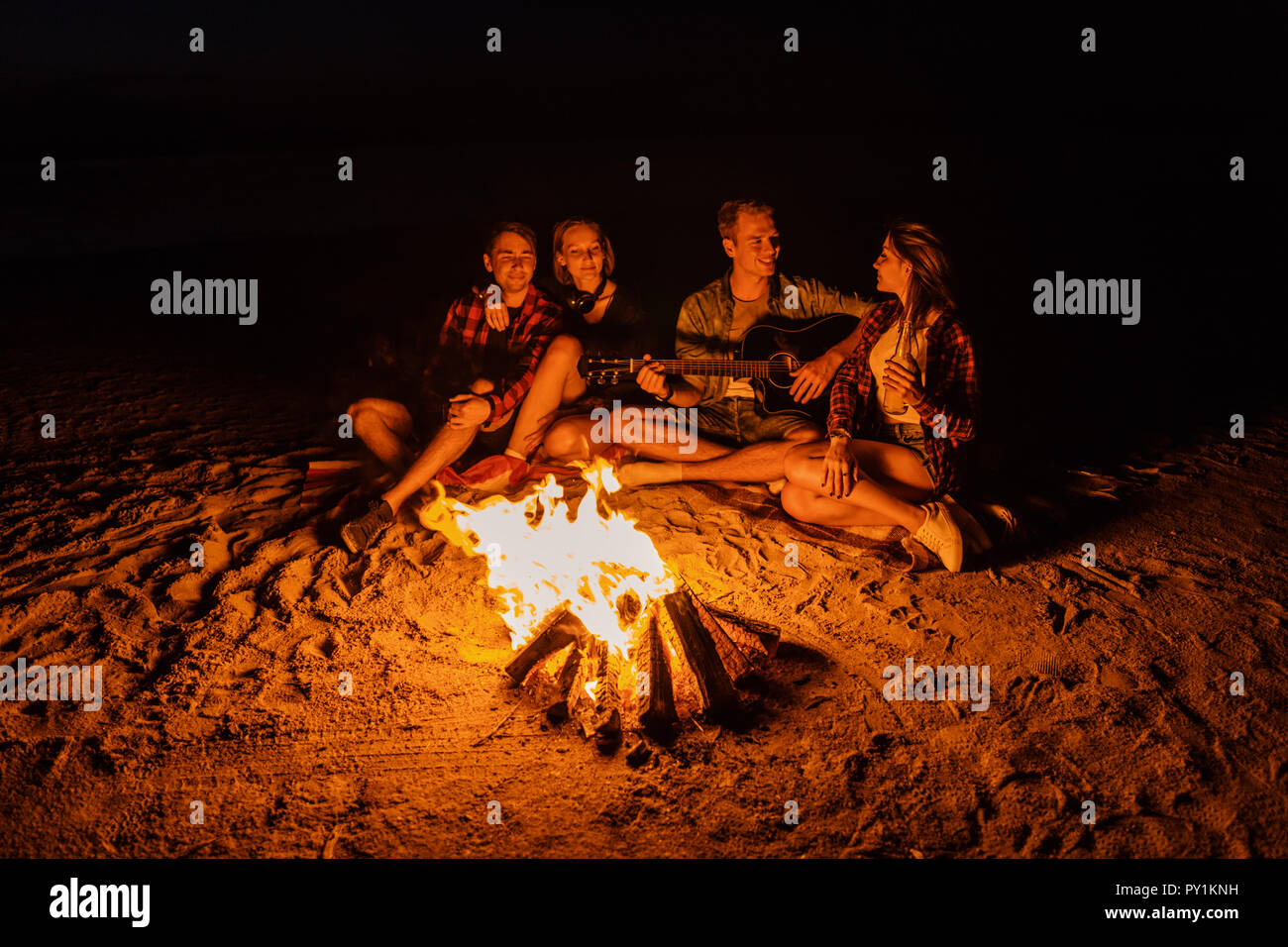 Giovani Amici Hanno Un Picnic Con Falo Sulla Spiaggia Foto Stock Alamy