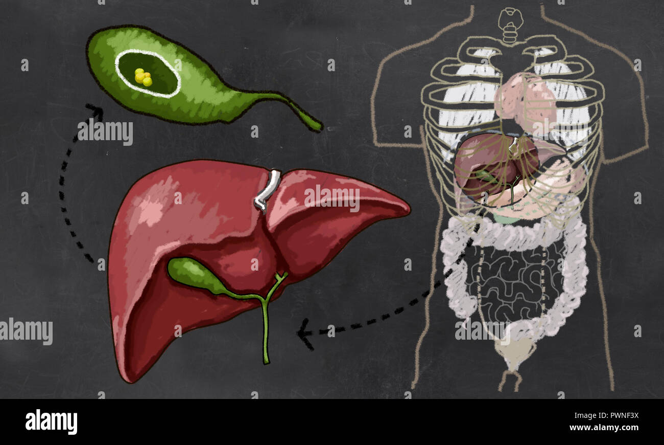 Calcoli Biliari Illustrazione Con Torso Del Fegato E Della Cistifellea Per Mostrare Le Dimensioni E Dettagli Foto Stock Alamy