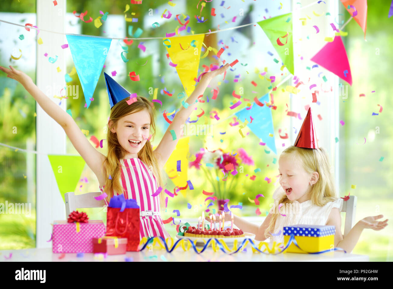 Due Divertenti Piccole Sorelle Di Festa Di Compleanno A Casa Soffiando Candele Sulla Torta Di Compleanno Kids Festa Di Compleanno Con Decorazioni Colorate Doni E Di Divieto Foto Stock Alamy