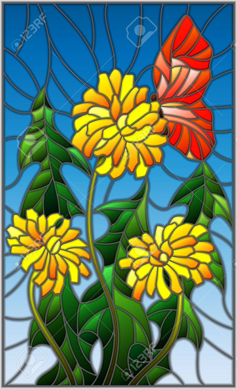 Vettoriale Illustrazione In Fiore Di Stile Di Vetro Macchiato Di Taraxacum E Farfalla Su Una Priorita Bassa Blu Image 81770043