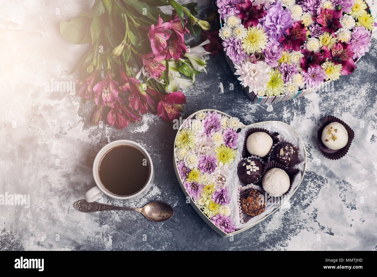 Confezione Regalo A Forma Di Cuore Con Fiori E Cioccolatini Una Tazza Di Caffe E Un Mazzo Di Fiori Su Un Sfondo Di Calcestruzzo Facile Tonificante Vista Dall Alto Foto Stock Alamy
