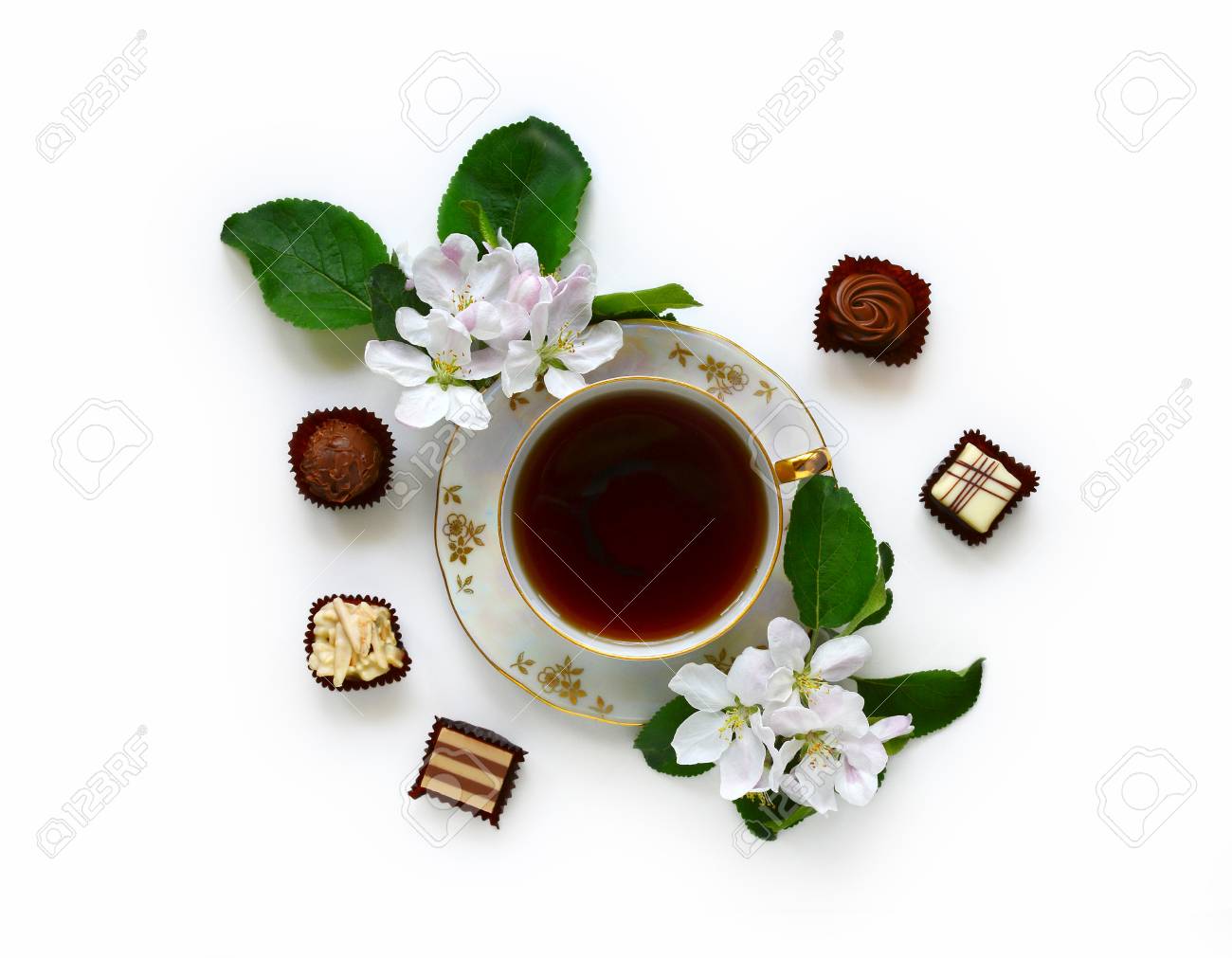 Immagini Stock Retro Tazza Di Te Con Cioccolatini E Fiori Di Mela Isolato Su Sfondo Bianco Image 58748741