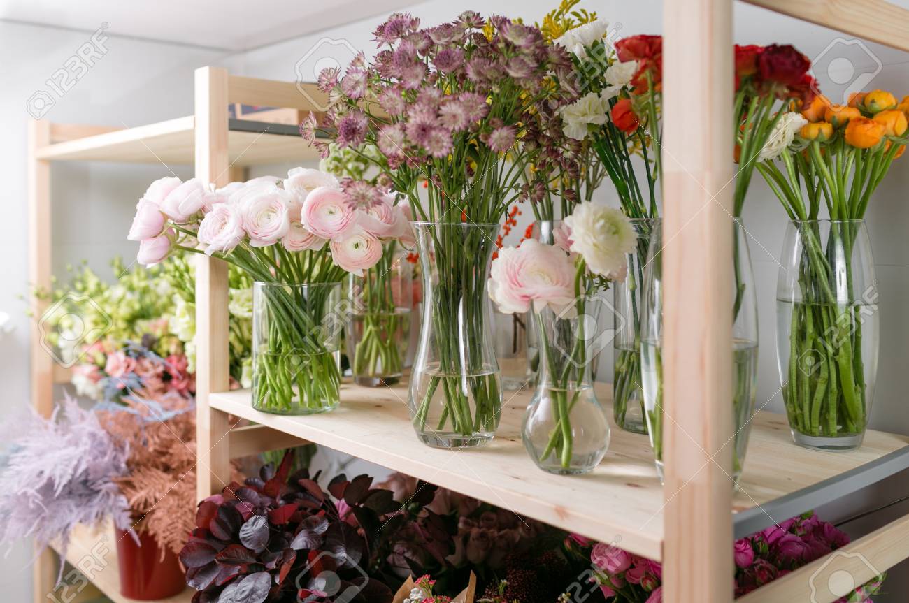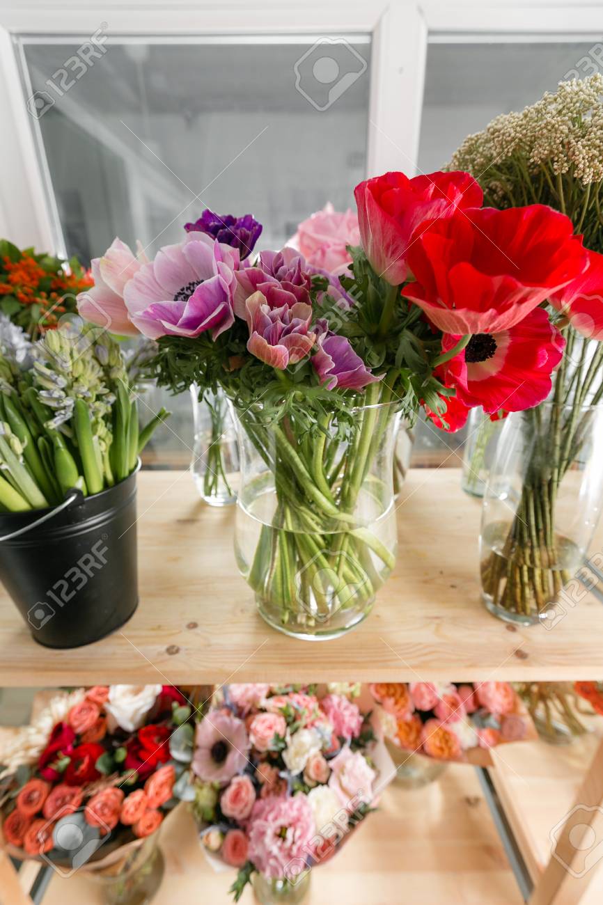Immagini Stock Diverse Varieta Fiori Freschi Di Primavera In Frigorifero Per Fiori Nel Negozio Di Fiori Mazzi Sulla Mensola Commercio Di Fioristi Image 90695061