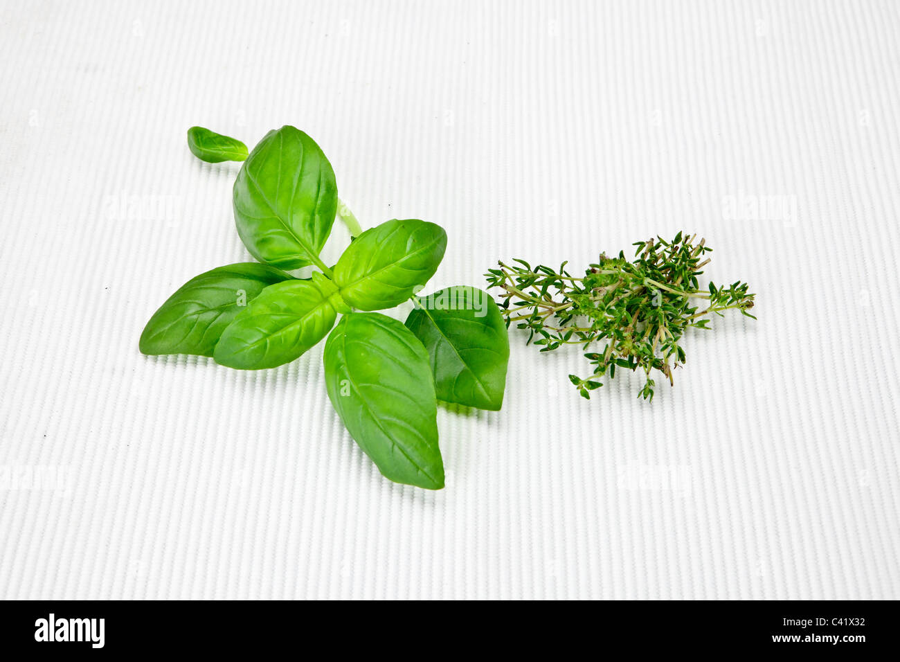 Foglie Di Basilico Fresco E Di Timo Fresco Su Un Tappetino Bianco Foto Stock Alamy