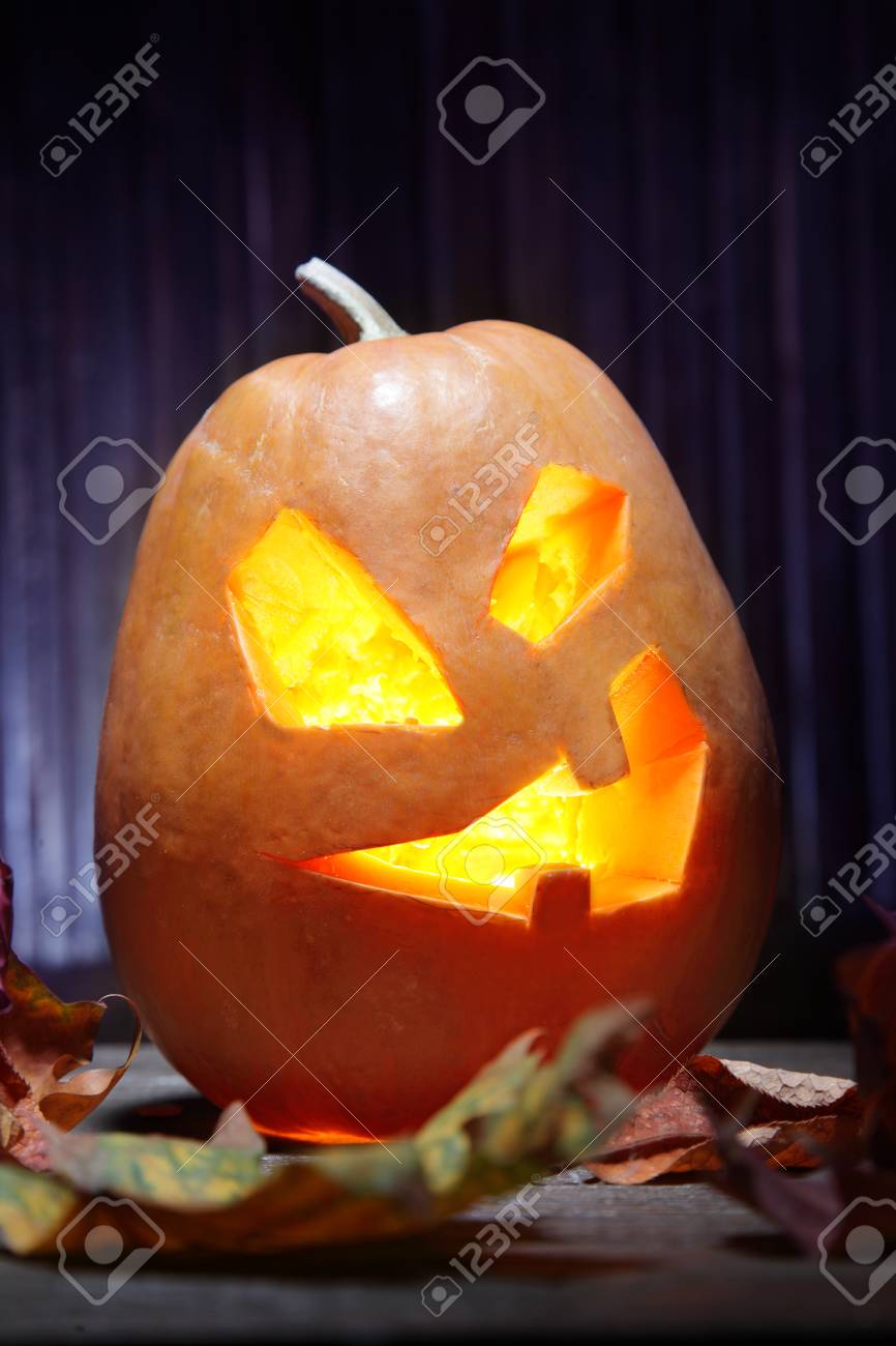 Immagini Stock Faccia Di Zucca Jack O Lanterne Di Halloween Su Priorita Bassa Di Legno E Foglie Di Autunno Image 32673740