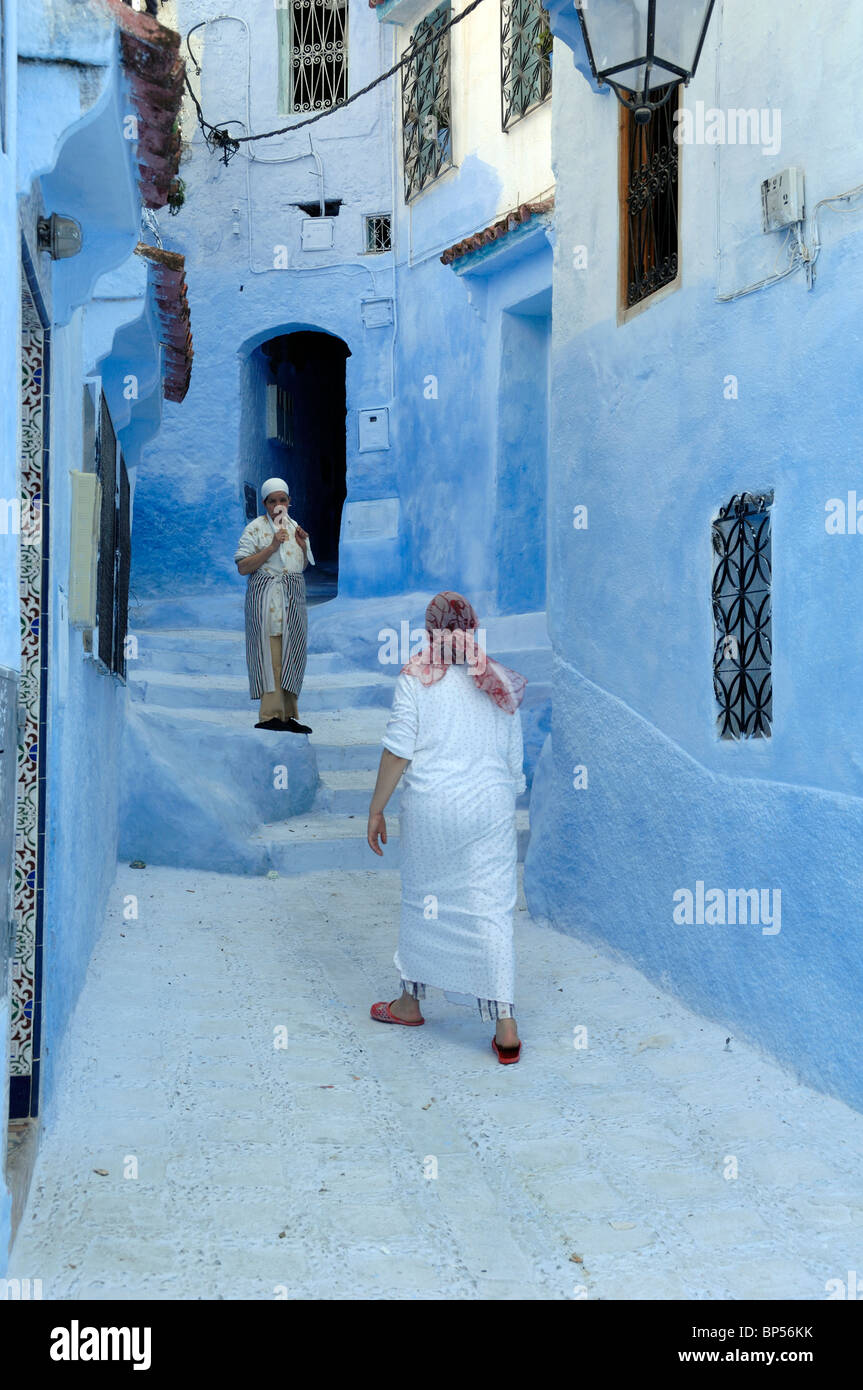 Coppia Di Donne Marocchine O Vicini Di Casa Soddisfare Chat Nelle Strette Strade Blu Di Chefchaouen Marocco Foto Stock Alamy