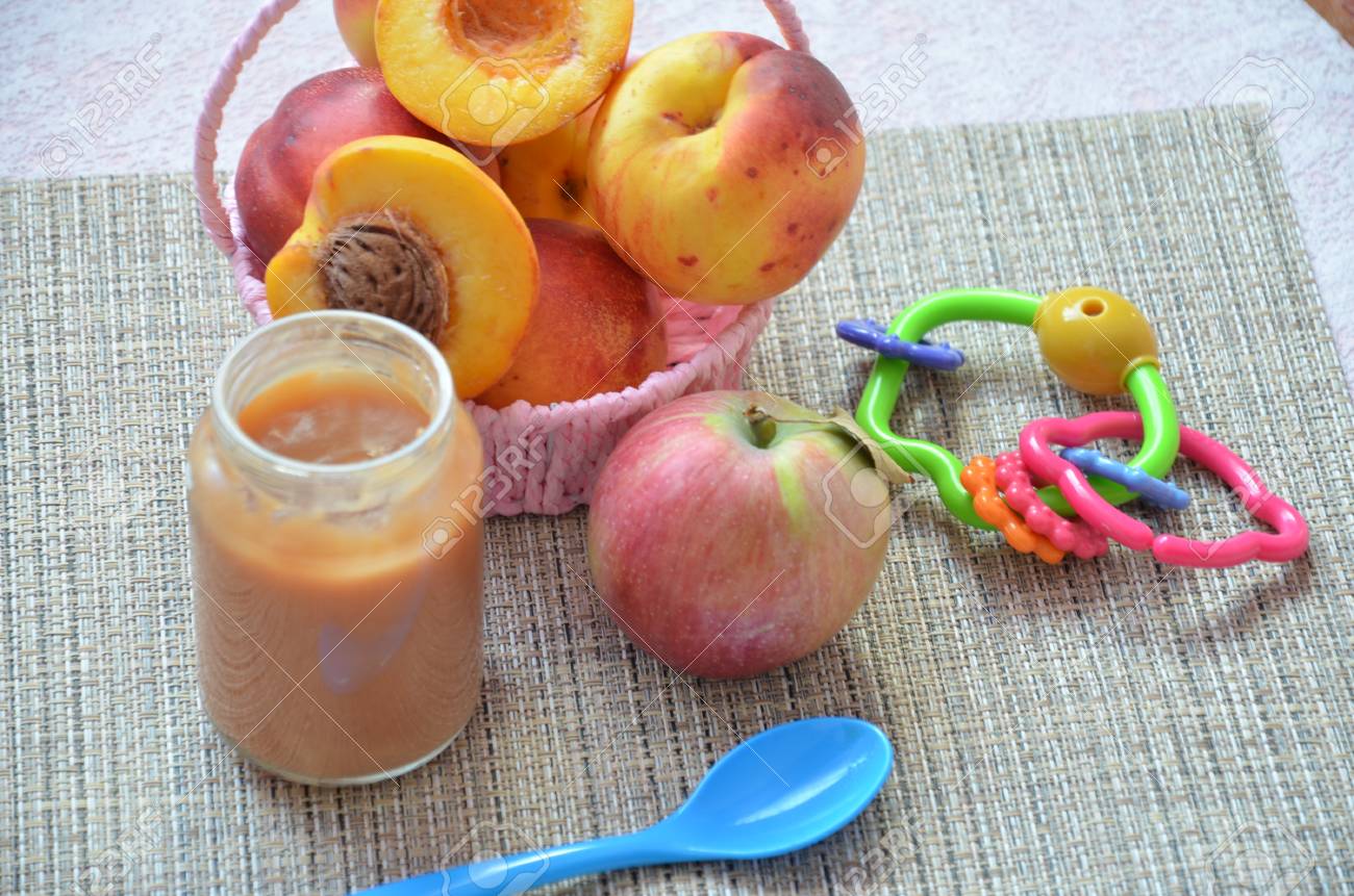 Immagini Stock Alimenti Per L Infanzia Frutta Per Bambini Pure In Un Barattolo Di Vetro Pesca Belle Pesche In Un Cestino Giocattolo Per Bambini Mela Image 86471582
