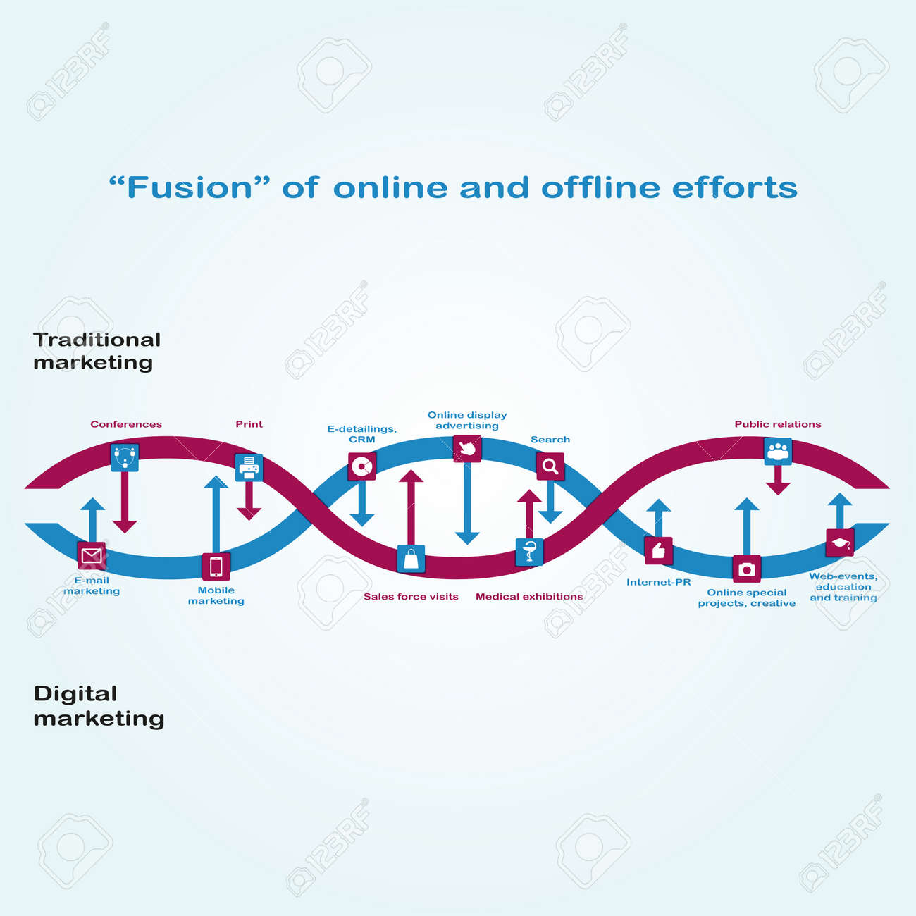 Vettoriale L Interazione Tra Marketing Digitale E Marketing Tradizionale E Raffigurato Come La Catena Del Dna Fusione Di Sforzi Online E Offline Image 49754310