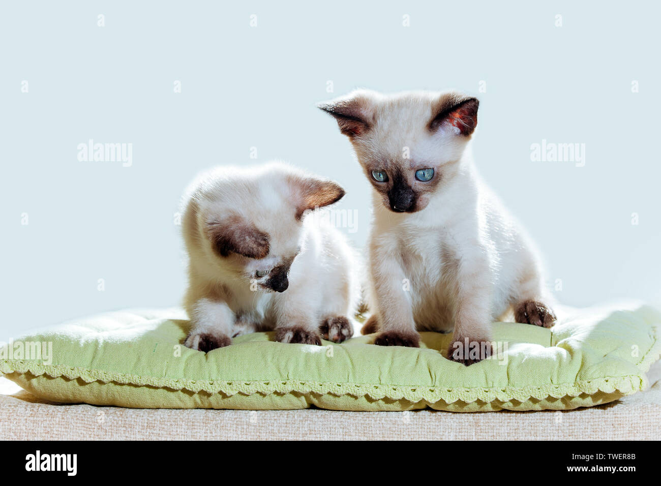 Due Piccoli Cuccioli Di Razza Thai Ai Raggi Del Sole Gatti Divertenti Con Gli Occhi Blu Su Uno Sfondo Bianco Foto Stock Alamy