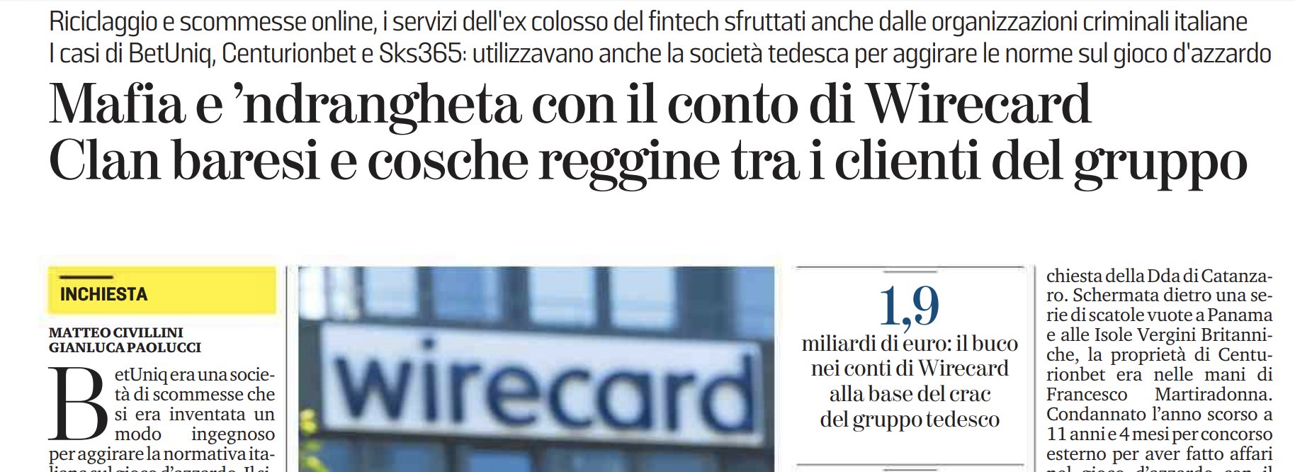 Matteo Civillini On Twitter New How Italian Mafias Used Wirecard On Their Gambling Platforms Wdi Processed Payments For Centurionbet As Fd Reported But It Didn T Stop There Betuniq Linked To Ndrangheta Had