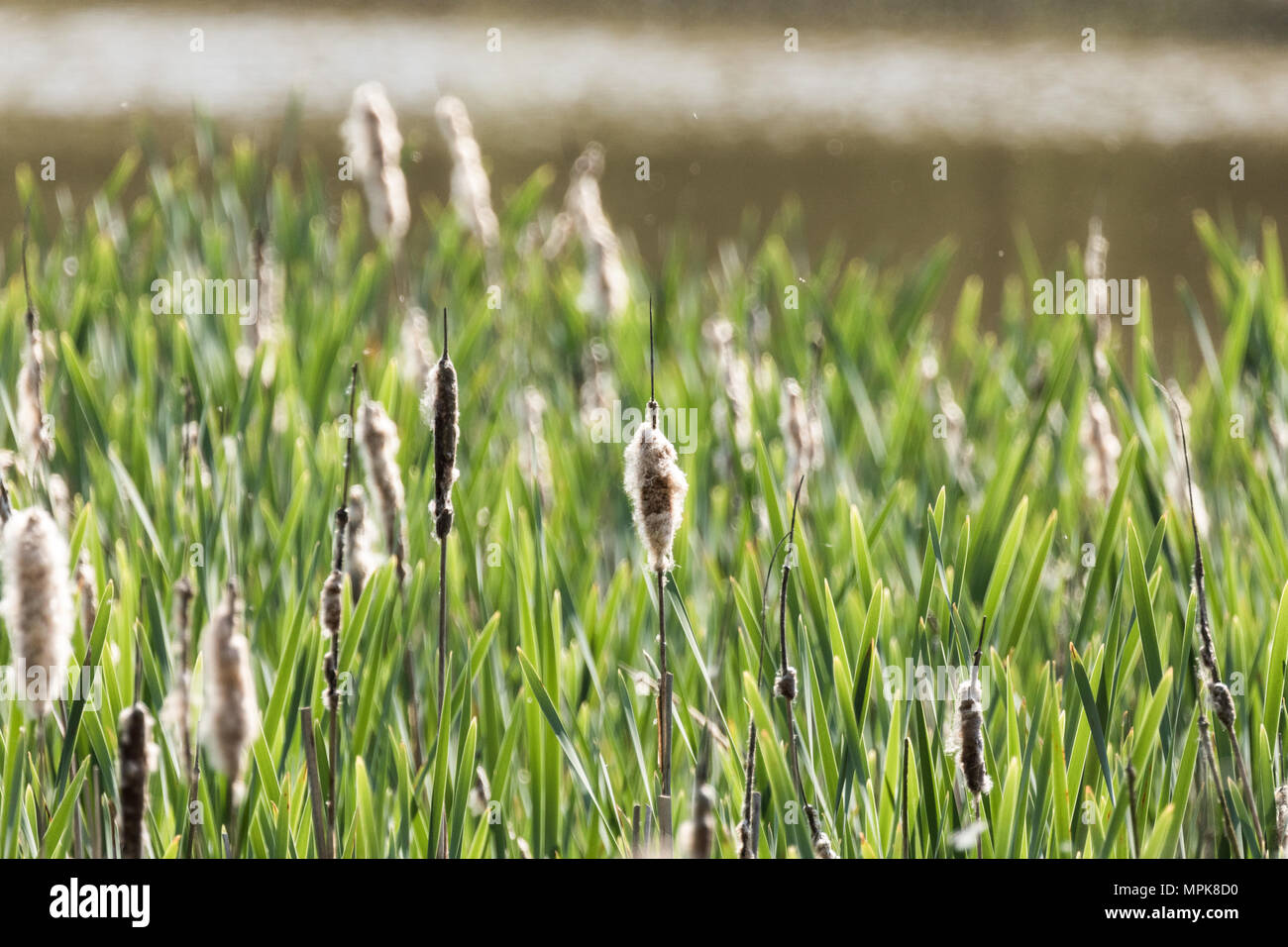Giunchi In Primavera Giunco Comune Latifoglie Aka Tifa O Grande Reedmace Typha Latifolia Con Soffici Teste Di Seme Nottinghamshire England Regno Unito Foto Stock Alamy