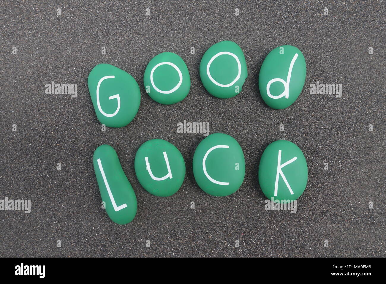 Good Luck Text With Green Colored Stones Over Black Volcanic Sand Stock Photo Alamy