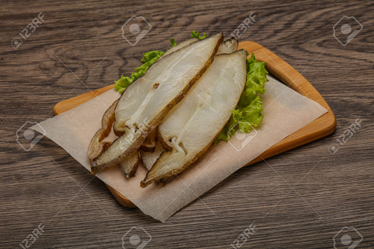 Immagini Stock Delicous Smoked Halibut Fish Slices Snack Image 158957884